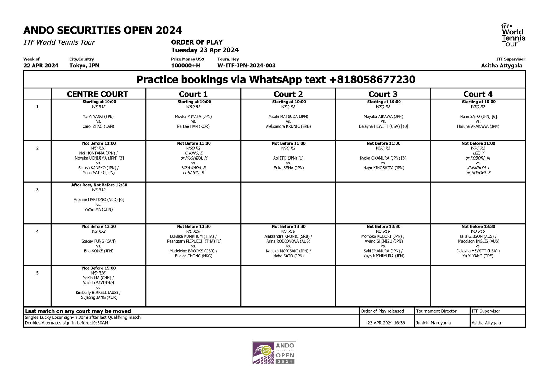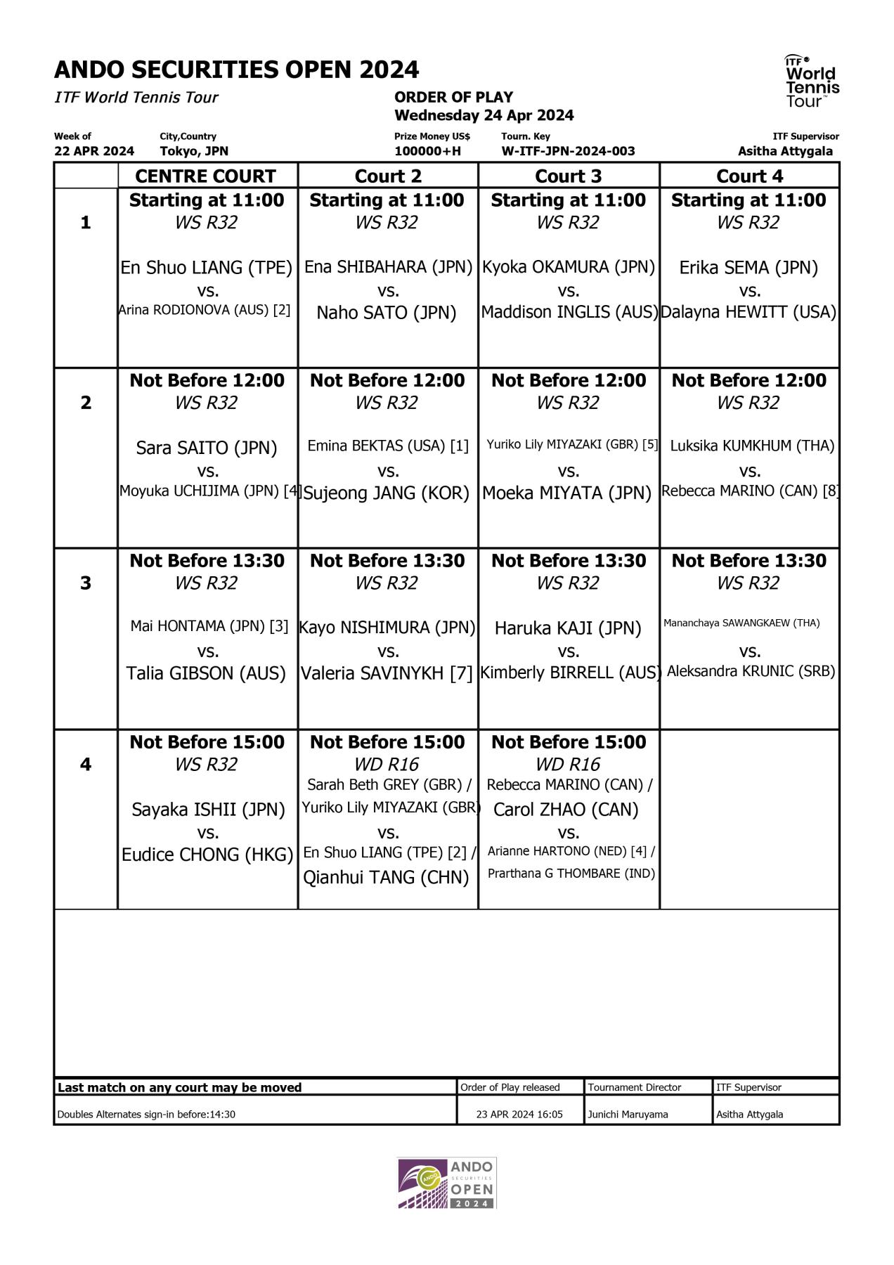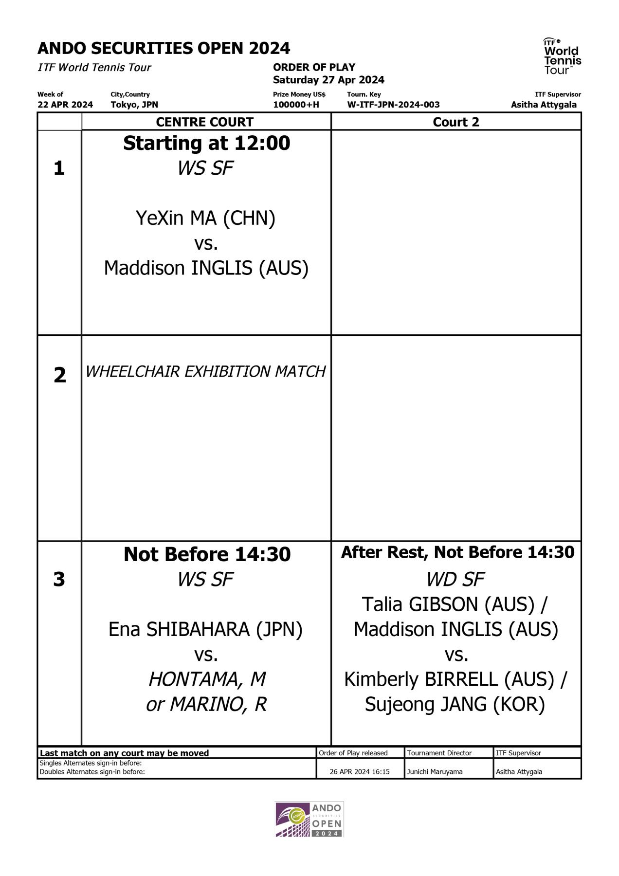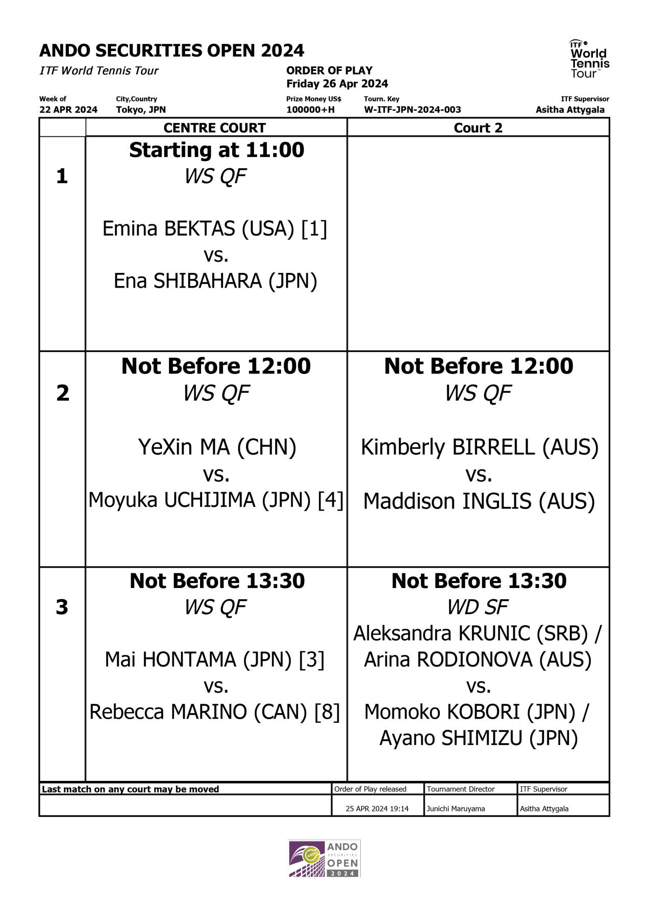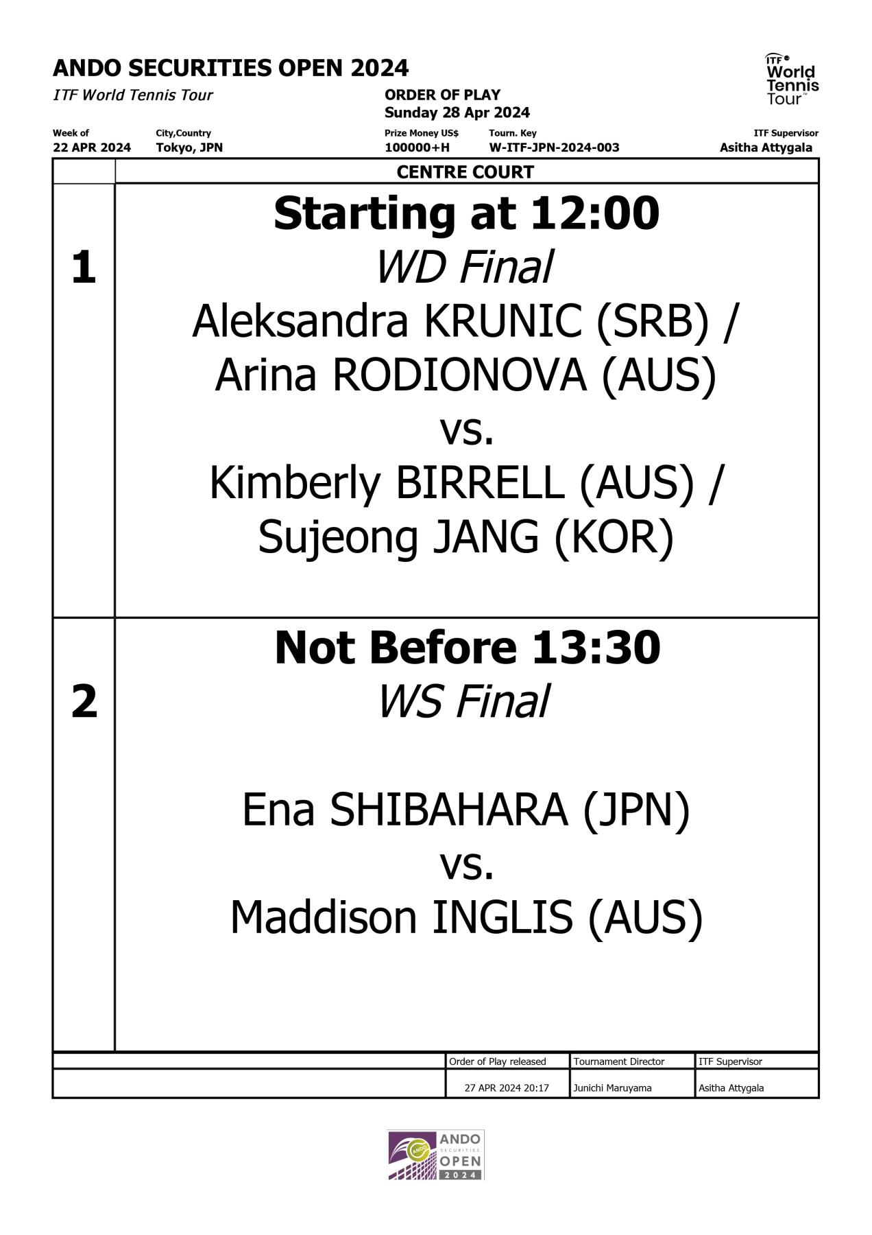4/28(日)12:00 ダブルス決勝(有明コロシアム)